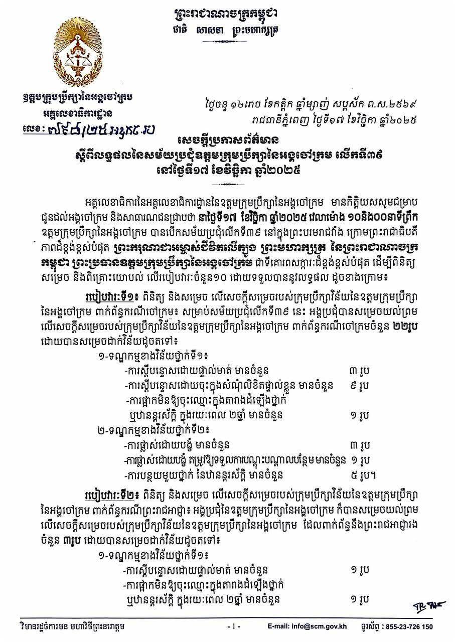 ភ្នំពេញ ៖ នៅថ្ងៃទី១៧ ខែវិច្ឆិកា ឆ្នាំ២០២៥ ឧត្តមក្រុមប្រឹក្សានៃអង្គចៅក្រម បានបើកសម័យប្រជុំលើកទី៣៩ នៅក្នុងព្រះបរមរាជវាំង ក្រោមព្រះរាជាធិបតីភាពដ៏ខ្ពង់ខ្ពស់បំផុត ព្រះករុណាជាអម្ចាស់ជីវិតលើត្បូង ព្រះមហាក្សត្រ នៃព្រះរាជាណាចក្រកម្ពុជា ព្រះប្រធានឧត្តមក្រុមប្រឹក្សានៃអង្គចៅក្រម ដើម្បីពិនិត្យសម្រេច និងពិគ្រោះយោបល់ លើរបៀបវារៈចំនួន១០ ដោយទទួលបាននូវលទ្ធផល ដូចខាងក្រោម ៖