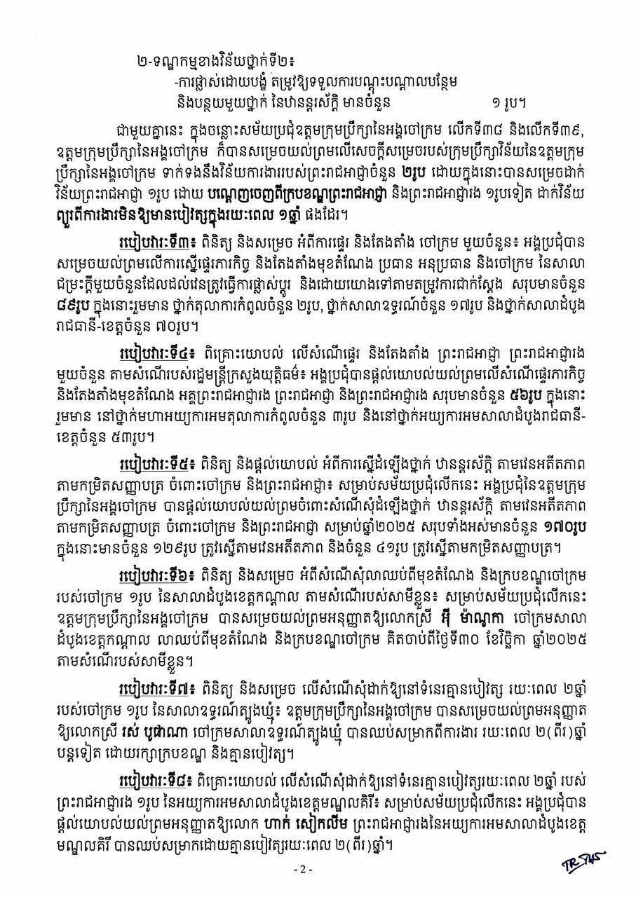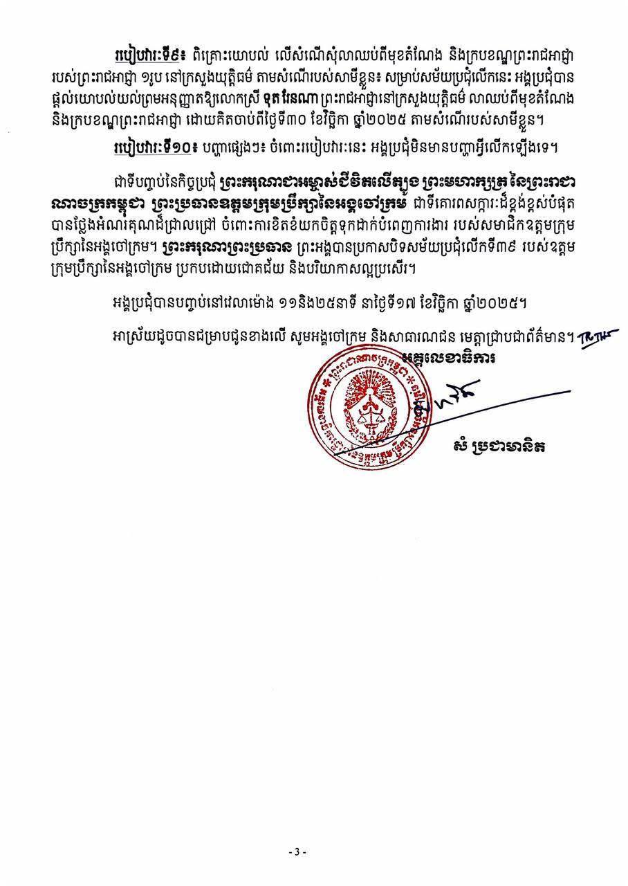 របៀបវារៈទី៩៖ ពិគ្រោះយោបល់ លើសំណើសុំលាឈប់ពីមុខតំណែង និងក្របខណ្ឌព្រះរាជអាជ្ញា របស់ព្រះរាជអាជ្ញា ១រូប នៅក្រសួងយុត្តិធម៌ តាមសំណើរបស់សាមីខ្លួន៖ សម្រាប់សម័យប្រជុំលើកនេះ អង្គប្រជុំបាន ផ្តល់យោបល់យល់ព្រមអនុញ្ញាតឱ្យលោកស្រី ទុត រែនណា ព្រះរាជអាជ្ញានៅក្រសួងយុត្តិធម៌ លាឈប់ពីមុខតំណែង និងក្របខណ្ឌព្រះរាជអាជ្ញា ដោយគិតចាប់ពីថ្ងៃទី៣០ ខែវិច្ឆិកា ឆ្នាំ២០២៥ តាមសំណើរបស់សាមីខ្លួន។