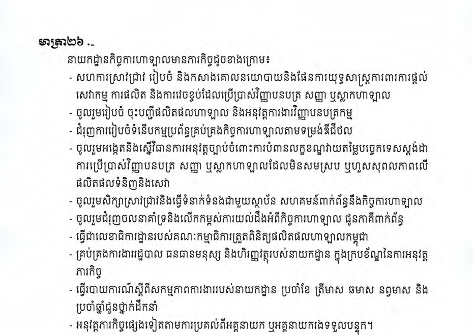 - ធ្វើជាលេខាធិការដ្ឋានរបស់គណៈកម្មាធិការត្រួតពិនិត្យផលិតផលហាឡាលកម្ពុជា
