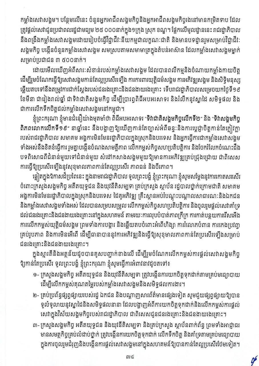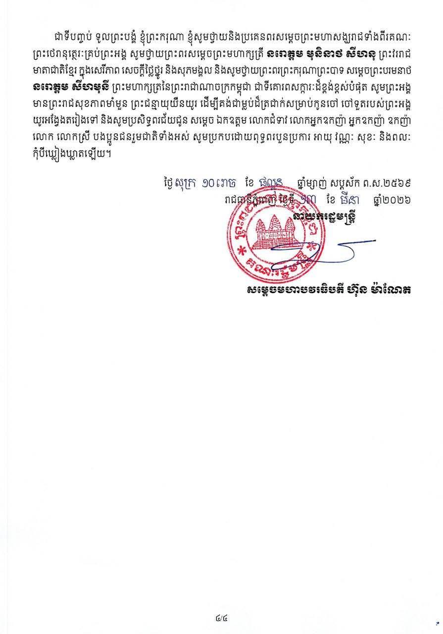 សារលិខិតសម្តេចមហាបវរធិបតី ហ៊ុន ម៉ាណែត នាយករដ្ឋមន្ត្រីនៃព្រះរាជាណាចក្រកម្ពុជា ក្នុងឱកាសទិវាជាតិសង្គមកិច្ចលើកទី២ និងទិវាសង្គមកិច្ចពិភពលោកលើកទី១៩ ថ្ងៃទី១៩ ខែមីនា ឆ្នាំ២០២៦