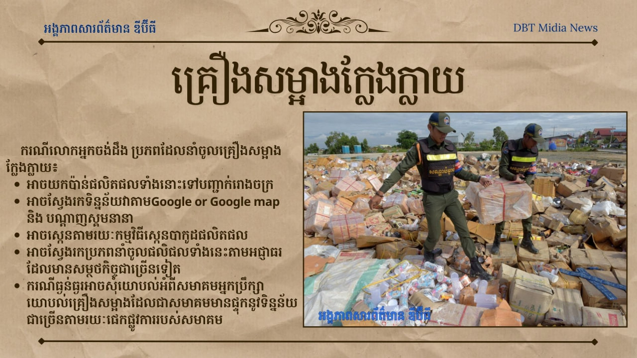 ករណីលោកអ្នកទិញប៉ះផលិតផលក្លែងក្លាយដែលធ្វើអោយប៉ះពាល់ដល់សុខភាពលោកអ្នកអាចស្វែងរកម្ចាស់របស់ផលិតផលបានតាមរយើៈ