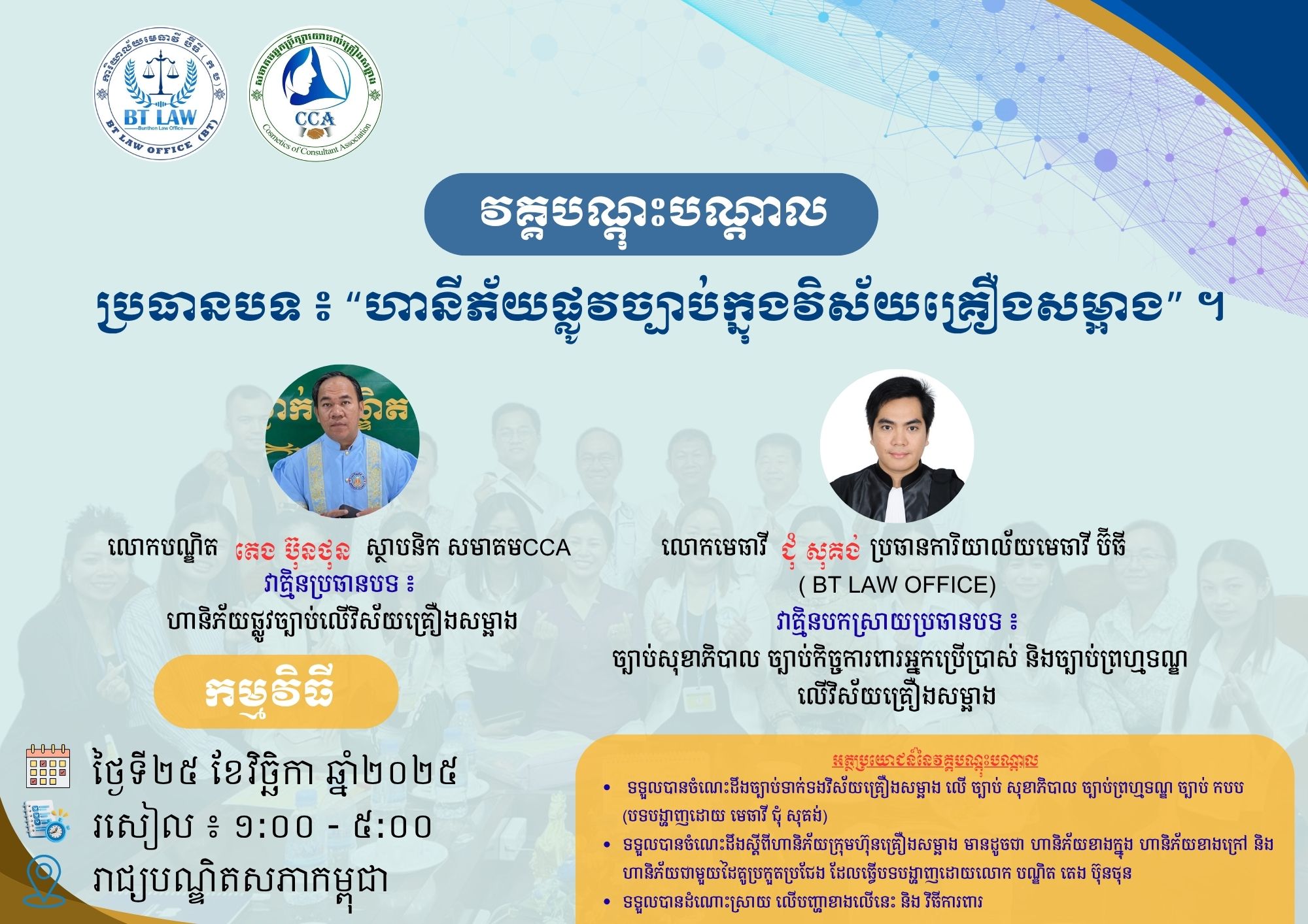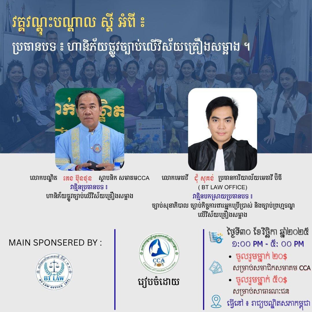 សមាគមអ្នកប្រឹក្សាយល់បល់គ្រឿងសម្អាងCCA និងបើកវគ្គបណ្តុះបណ្តាលស្តីអំពី “ហានិភ័យផ្លូវច្បាប់លើវិស័យគ្រឿងសម្អាងនៅកម្ពុជា” ធ្វើនៅថ្ងៃទី៣០ ខែវិច្ឆិកា ឆ្នាំ២០២៥ ខាងមុខនេះ ។