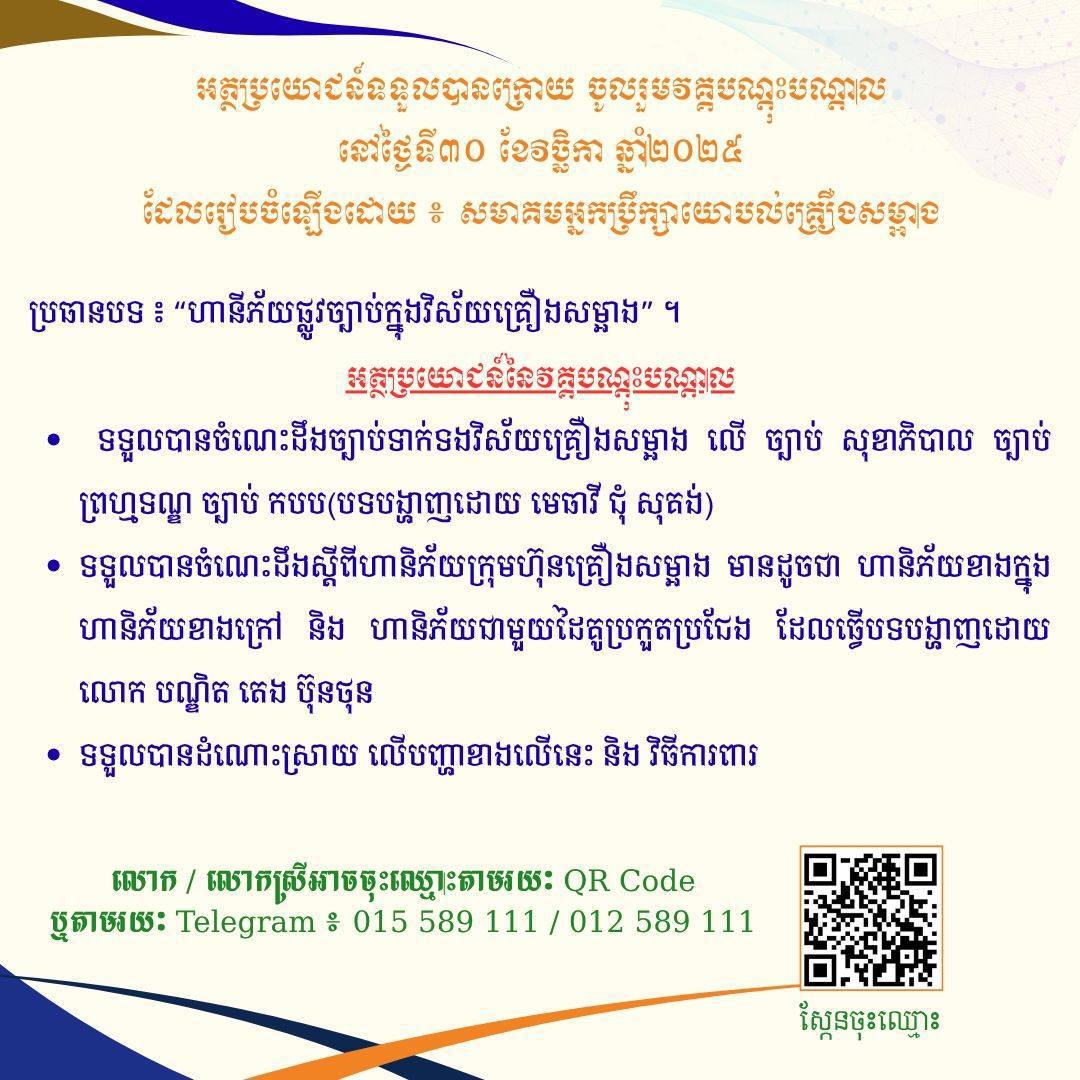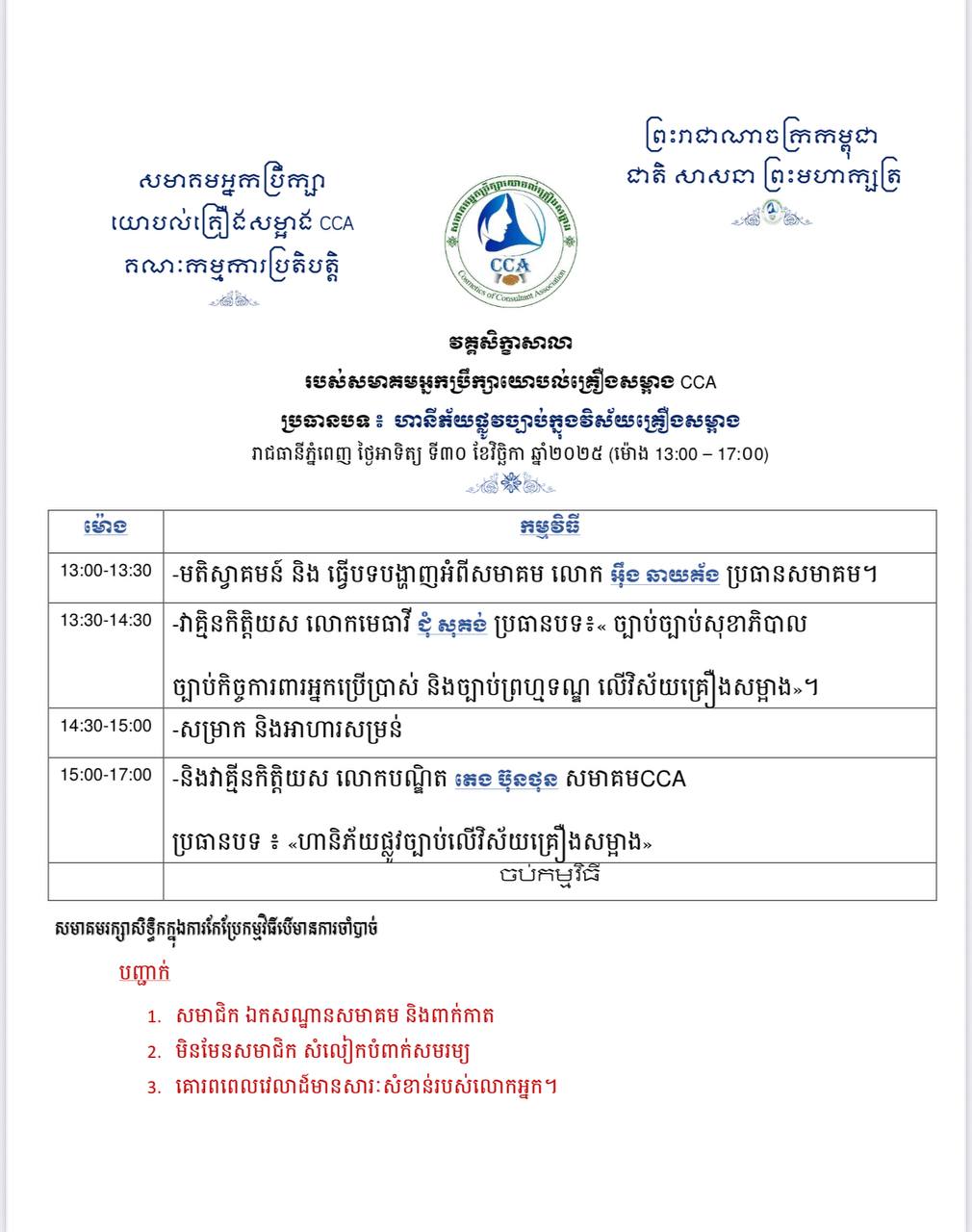 រាជធានីភ្នំពេញ៖យោងលិខិតលេខ ៧៨ សជណ ចុះថ្ងៃទី ១៨ ខែវិឆ្ឆិកា ឆ្នាំ ២០២៥របស់សមាគមគ្រឿងសម្អាងCCAបានអោយដឹងថា សមាគមនេះគ្រោងធ្វើសិក្ខាសាលាស្តីអំពីហានិភ័យផ្លូវច្បាប់វិស័យគ្រឿងសម្អាងដល់សិក្ខាកាមចំនួន៥០រូបដែលមានវាគ្មិនចំនួន២រូបនោះគឺ លោកបណ្ឌិត តេង ប៊ុនថុន អតីតប្រធានក្រុមបង្ក្រាបផលិតផលក្លែងក្លាយ និង ធ្វើបទបង្ហាញអំពីហានិភ័យនានាជុំវិញវិស័យគ្រឿងសម្អាង ជាពិសេសផ្តល់ដំណោះស្រាយ វិធីការពារដល់សិក្ខាកាមដែលបានចូលរួម។