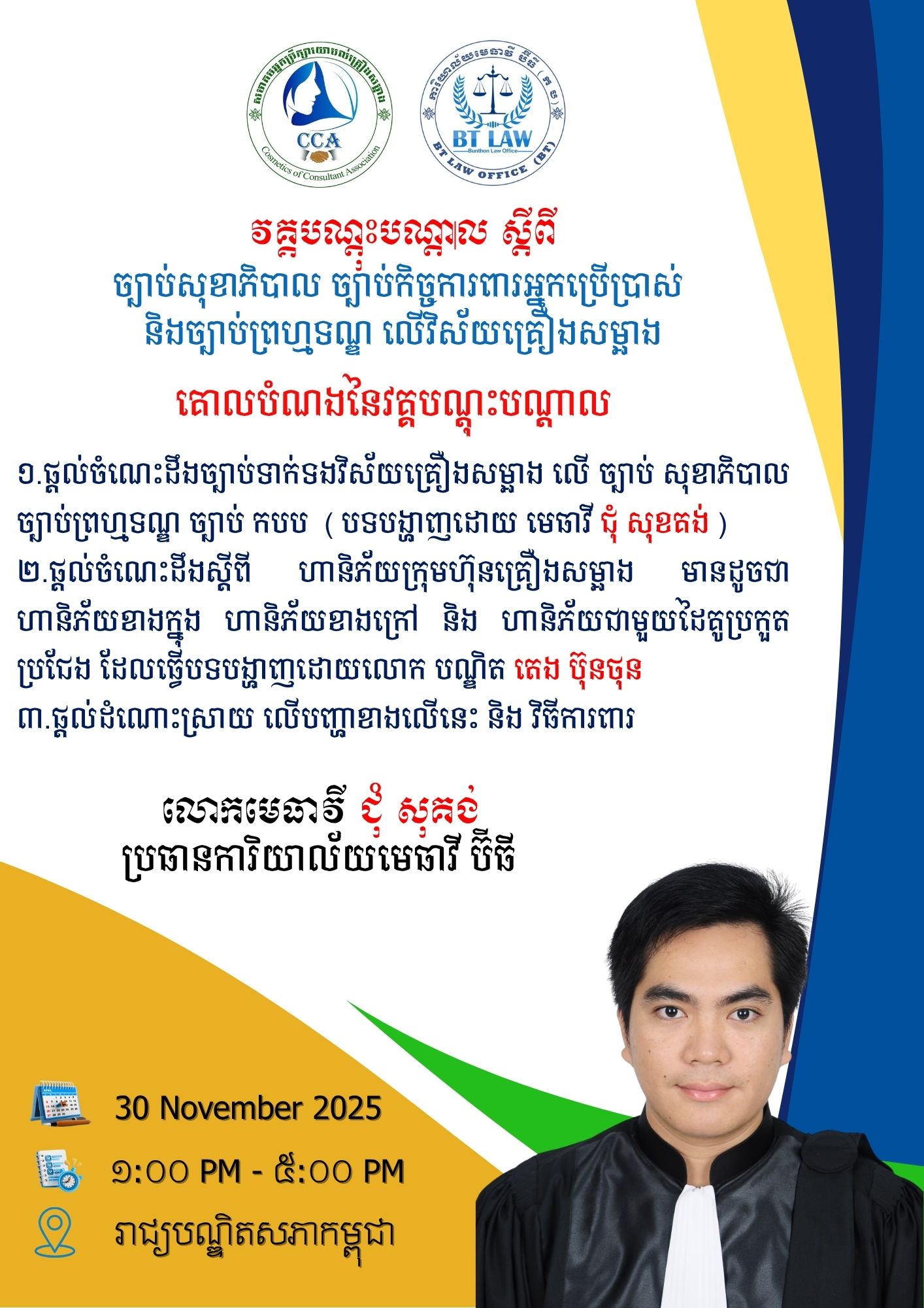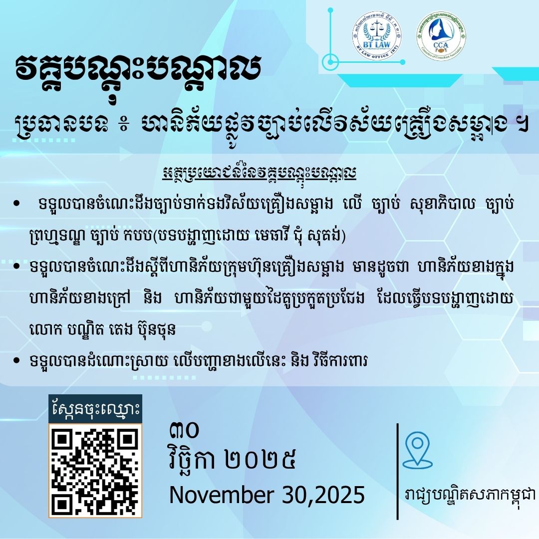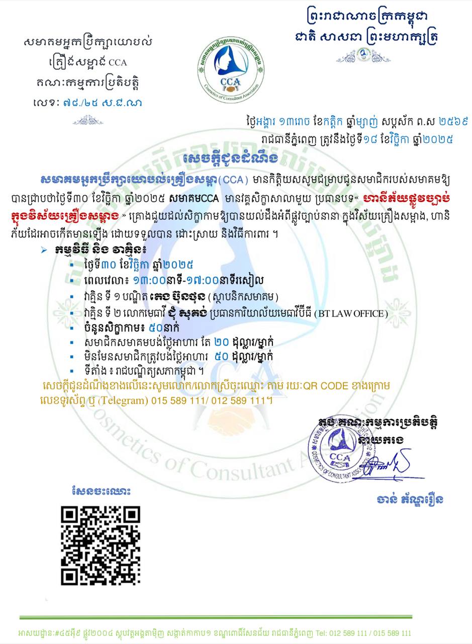សមាគមអ្នកប្រឹក្សាយល់បល់គ្រឿងសម្អាងCCA និងបើកវគ្គបណ្តុះបណ្តាលស្តីអំពី “ហានិភ័យផ្លូវច្បាប់លើវិស័យគ្រឿងសម្អាងនៅកម្ពុជា” ធ្វើនៅថ្ងៃទី៣០ ខែវិច្ឆិកា ឆ្នាំ២០២៥ ខាងមុខនេះ ។