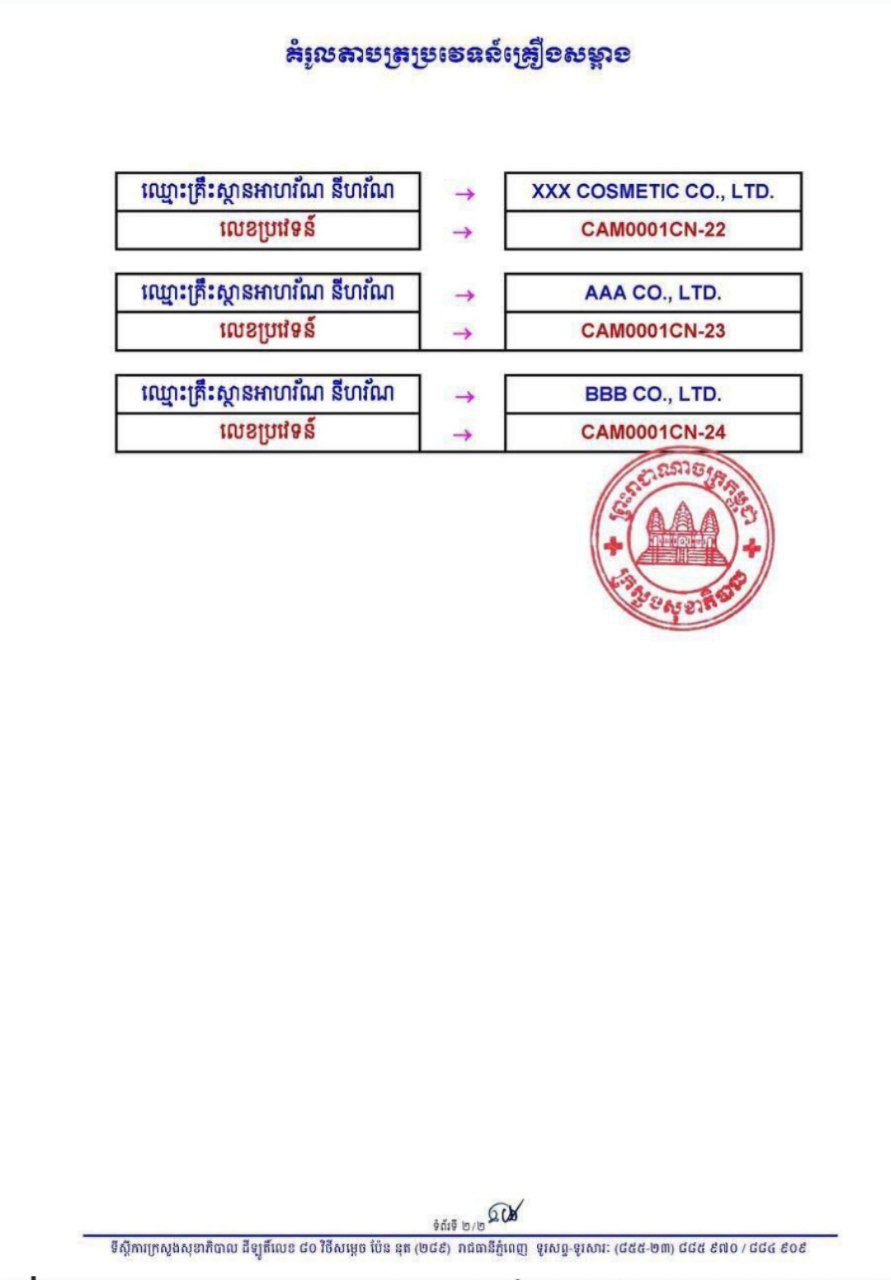 ដោយអនុលោមតាមច្បាប់ស្តីពីការគ្រប់គ្រងឱសថ និងច្បាប់ស្តីពីវិសោធនកម្មច្បាប់ស្តីពីការគ្រប់គ្រងឱសថតម្រូវឱ្យរាល់ការចរចរផលិតផលគ្រឿងសម្អាងគ្រប់ប្រភេទ ត្រូវមានលេខប្រវេទន៍ទទួលស្គាល់ពីក្រសួងសុខាភិបាល។ ដូច្នេះ មុននឹងទិញផលិតផលគ្រឿងសម្អាងគ្រប់ប្រភេទ សូមអ្នកប្រើប្រាស់ពិនិត្យមើលលតាបត្រប្រវេទន៍ ដែលមានបិទលើសំបកវេចខ្ចប់ ហើយលតាបត្រប្រវេទន៍ត្រឹមត្រូវគឺមាន២ផ្នែក ១-ផ្នែកខាងលើមានឈ្មោះគ្រឹះស្ថានអាហរ័ណ នីហរ័ណ និង២-ផ្នែកខាងក្រោមមានលេខប្រវេទន៍ ដូចមានគំរូបភ្ជាប់មកជាមួយ។