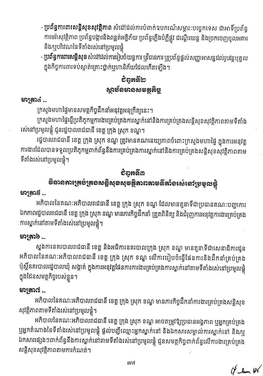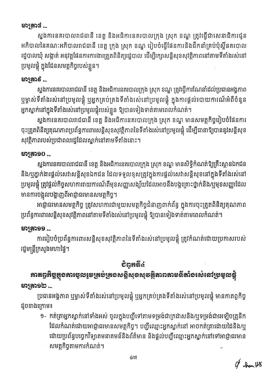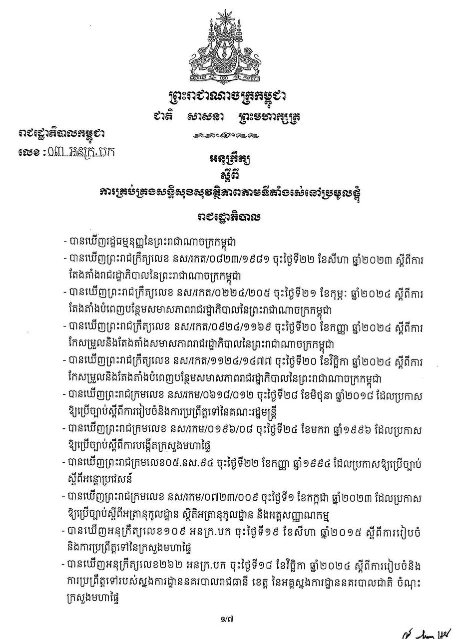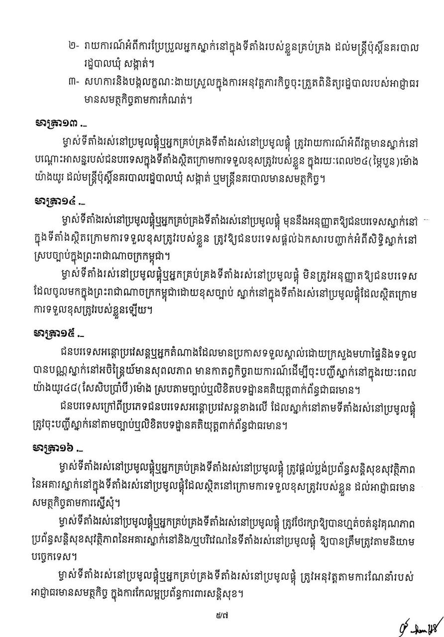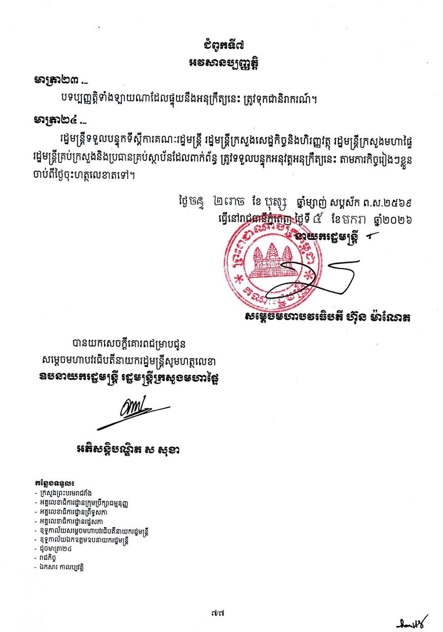 រាជធានីភ្នំពេញ៖ យោងអនុក្រឹត្យលេខៈ០៣ អនក្រ.បក ចុះថ្ងៃទី៥ ខែមករា ឆ្នាំ២០២៦ រាជរដ្ឋាភិបាលកម្ពុជាបានដាក់ចេញវិធានការតឹងរឹងលើការគ្រប់គ្រងមនុស្សនៅតាមទីប្រជុំជន ជាពិសេសជនបរទេស។ ម្ចាស់ទីតាំងលាក់បំពួនជនបរទេសនឹងពិន័យប្រាក់៤លានរៀល សម្រាប់ជនបរទេសម្នាក់ ដោយមិនទាន់រាប់បញ្ចូលទោសទណ្ឌដទៃទៀតនោះឡើយ។