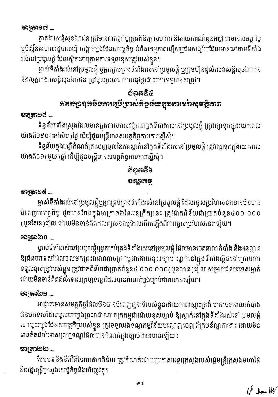ម្ចាស់ទីតាំងលាក់បំពួនជនបរទេសនឹងពិន័យប្រាក់៤លានរៀល សម្រាប់ជនបរទេសម្នាក់ដោយមិនទាន់រាប់បញ្ចូលទោសទណ្ឌដទៃទៀតនោះឡើយ។