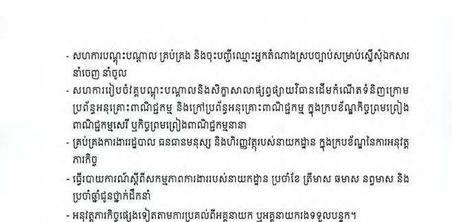 អនុវត្តភារកិច្ចផ្សេងទៀតតាមការប្រគល់ពីអគ្គនាយក ឬអគ្គនាយករងទទួលបន្ទុក។