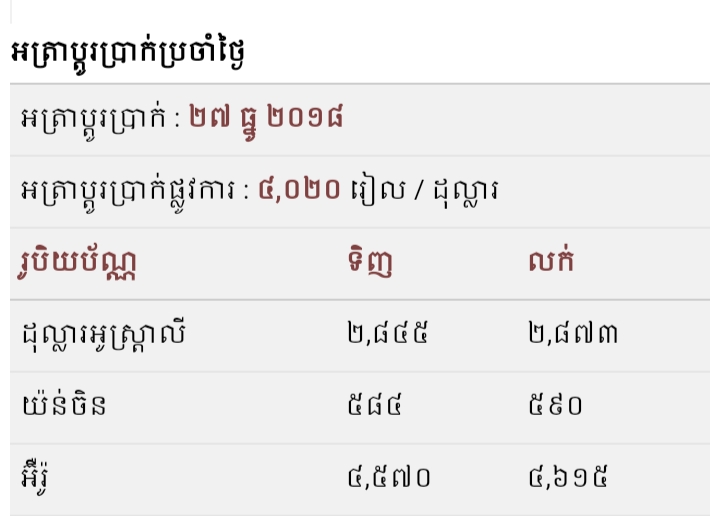 ភ្នំពេញ ៖ អត្រាប្តូរប្រាក់រវាងរូបិយប័ណ្ណជាមួយប្រាក់រៀល សម្រាប់ថ្ងៃទី ២៧ ខែ ធ្នូ ឆ្នាំ២០១៨ ។ ចំពោះអត្រាប្ដូរប្រាក់រៀលធៀបនឹងប្រាក់ដុល្លារគឺ ៤០២០៛/១ដុល្លារ។