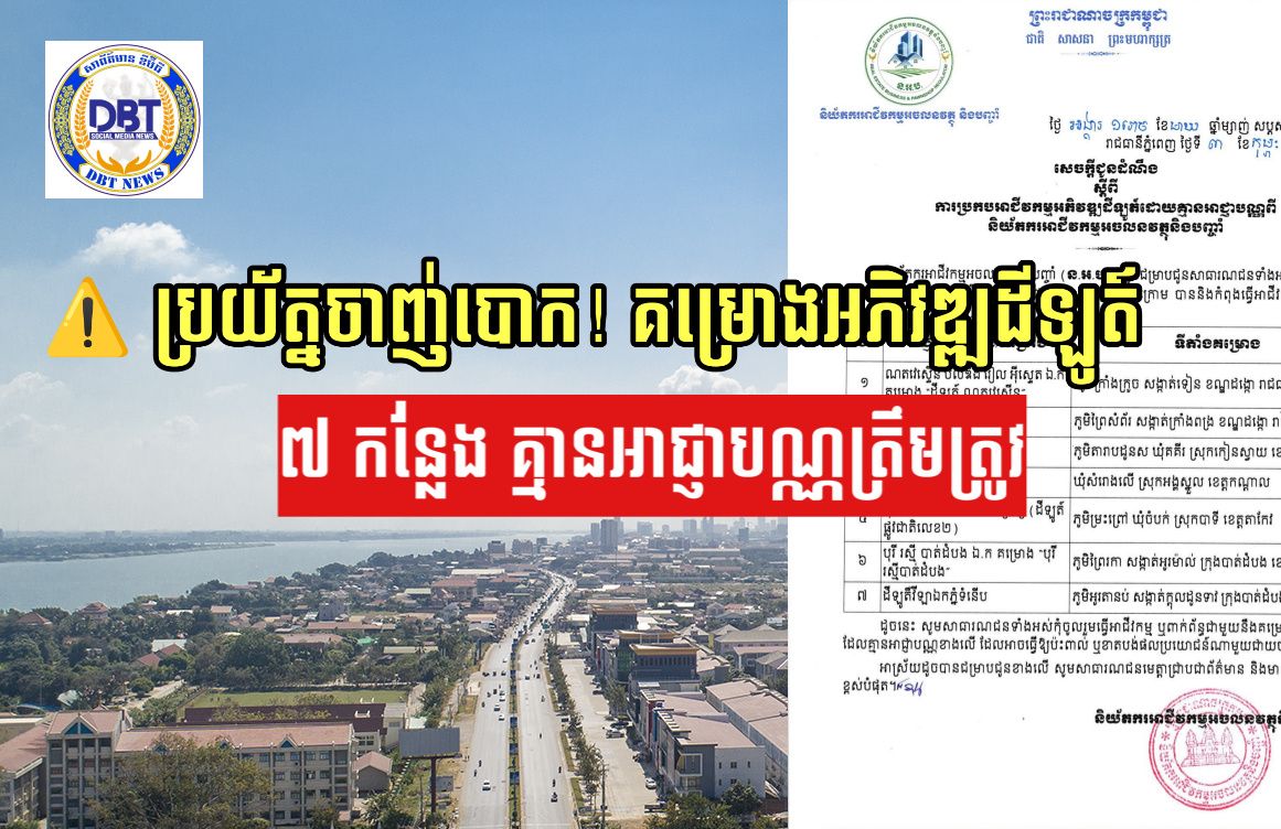 សូមជម្រាបជូនសាធារណជនមេត្តាជ្រាបថា បច្ចុប្បន្នមាន គម្រោងអភិវឌ្ឍដីឡូត៍ចំនួន ៧ កំពុងប្រកបអាជីវកម្ម ដោយគ្មានអាជ្ញាបណ្ណពី ន.អ.ប. នៅក្នុងរាជធានីភ្នំពេញ និងខេត្តកណ្តាល តាកែវ និងបាត់ដំបង។